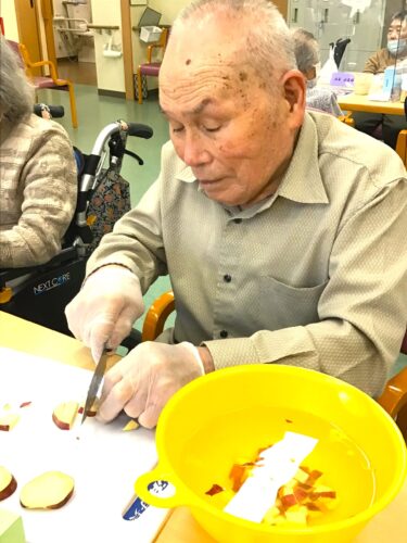 みなさんにサツマイモ、りんごをカットしてもらい