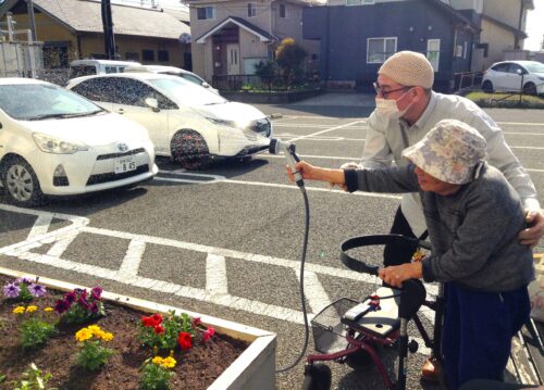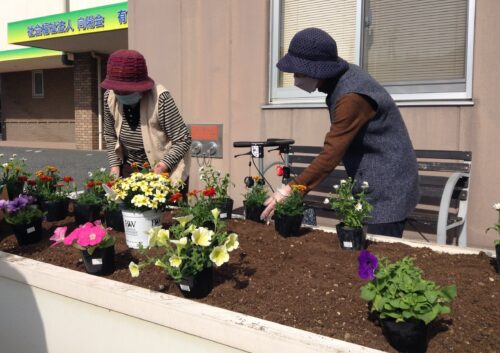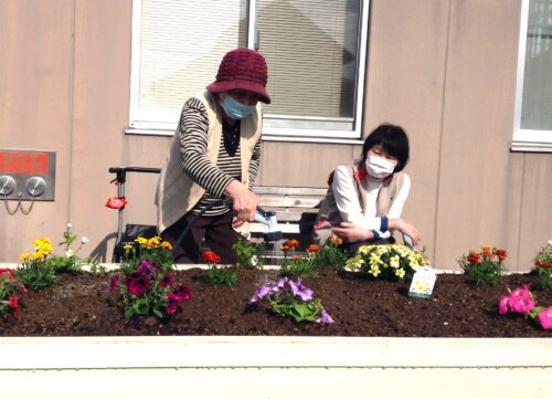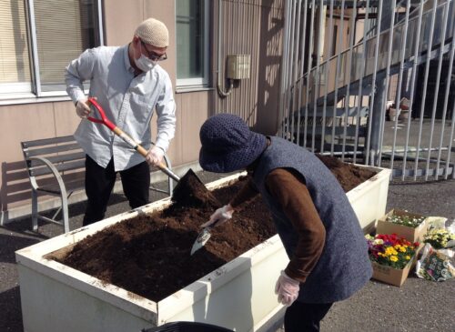 敷地内の花壇に入居者様と一緒に花の苗植えをしました。 まずは花壇の土を耕して肥料を混ぜ