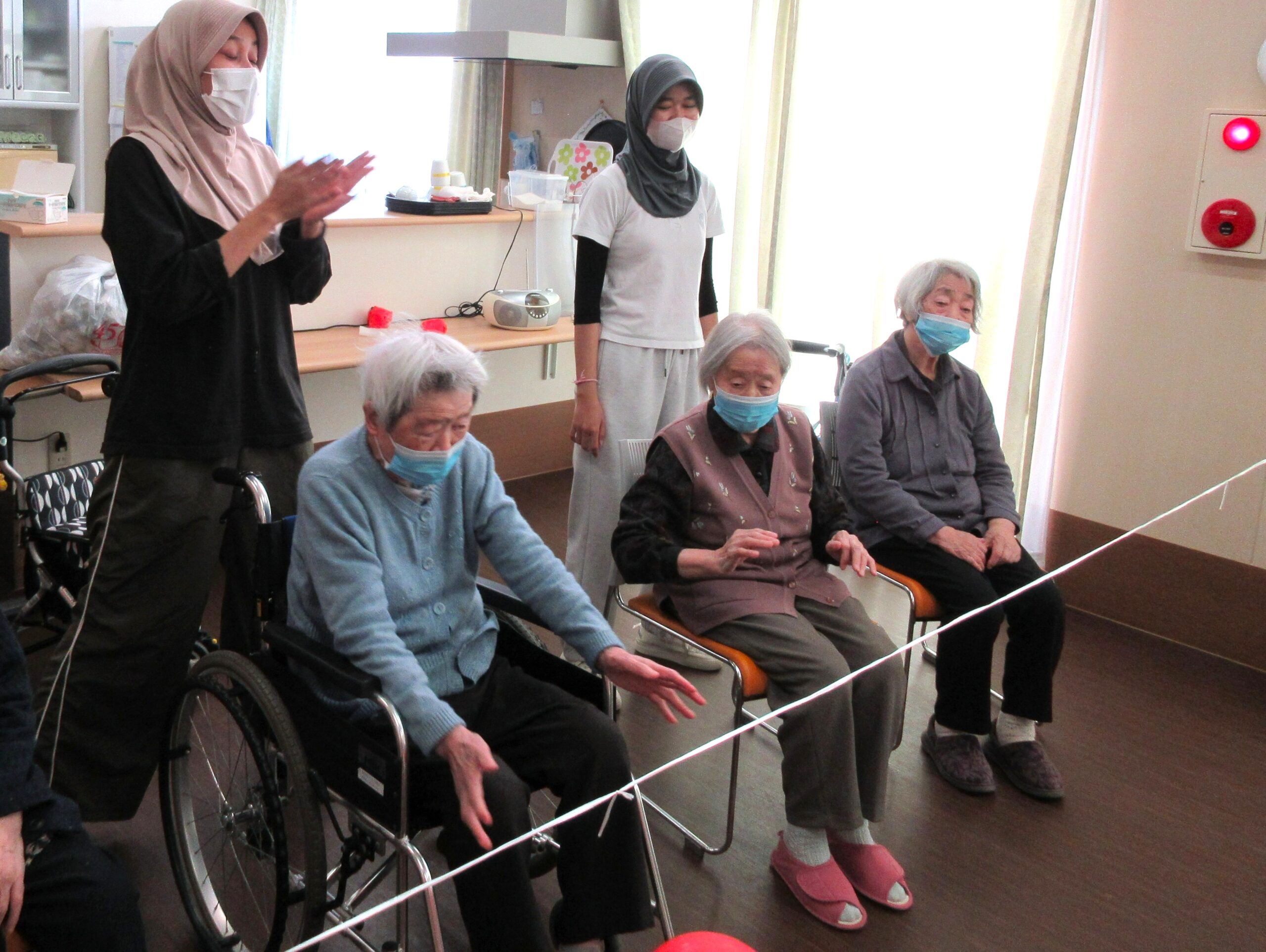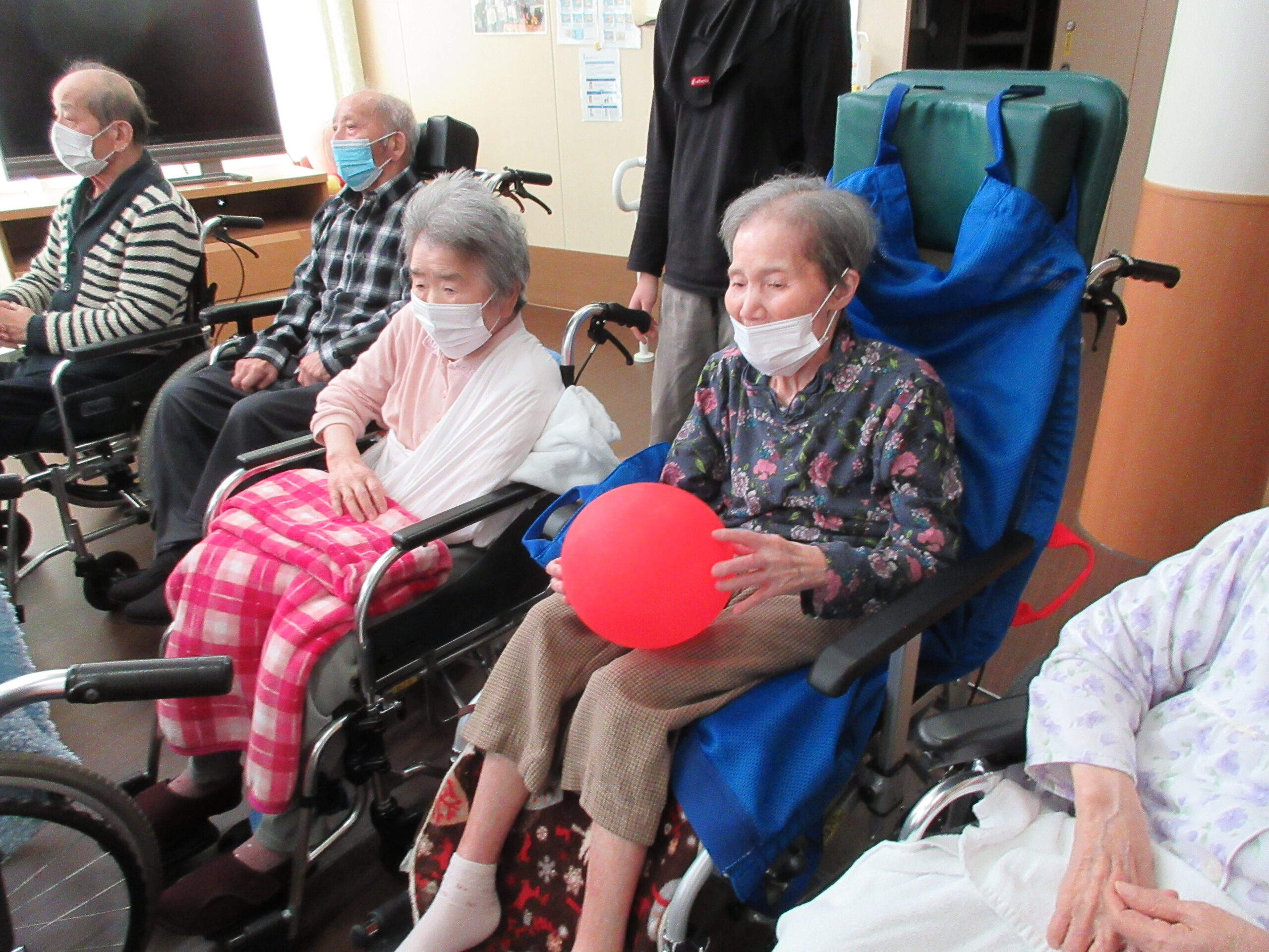 風船バレーでは声を掛け合い、